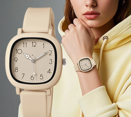 Para as que gostam de um toque esportivo sem perder o estilo, esse relógio é um achado! O mostrador quadrado com algarismos arábicos e a pulseira de silicone são super confortáveis para o dia a dia agitado.